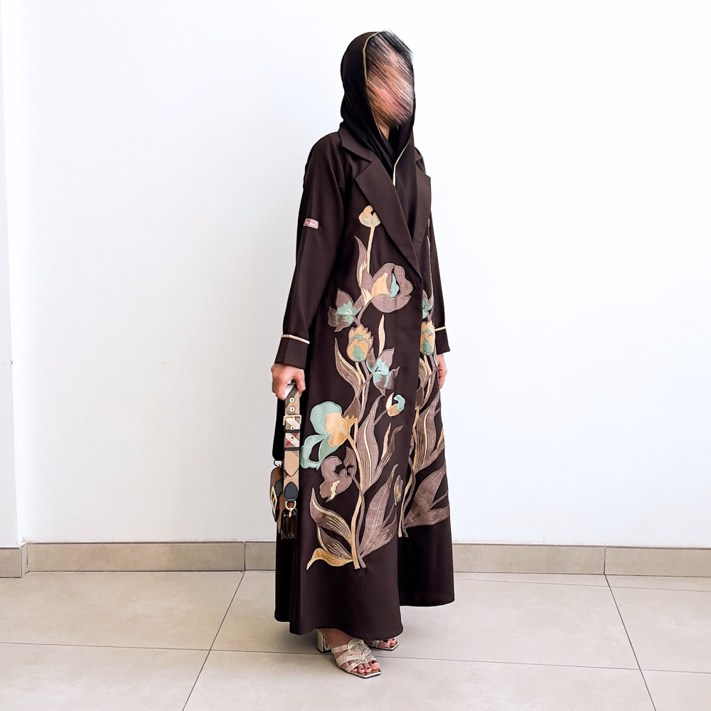 - عباية بني بلون أنيق وسهل التنسيق حيث أن البني الدافئ يعطي لمسة فاخرة ويتماشى مع مختلف الإكسسوارات.
