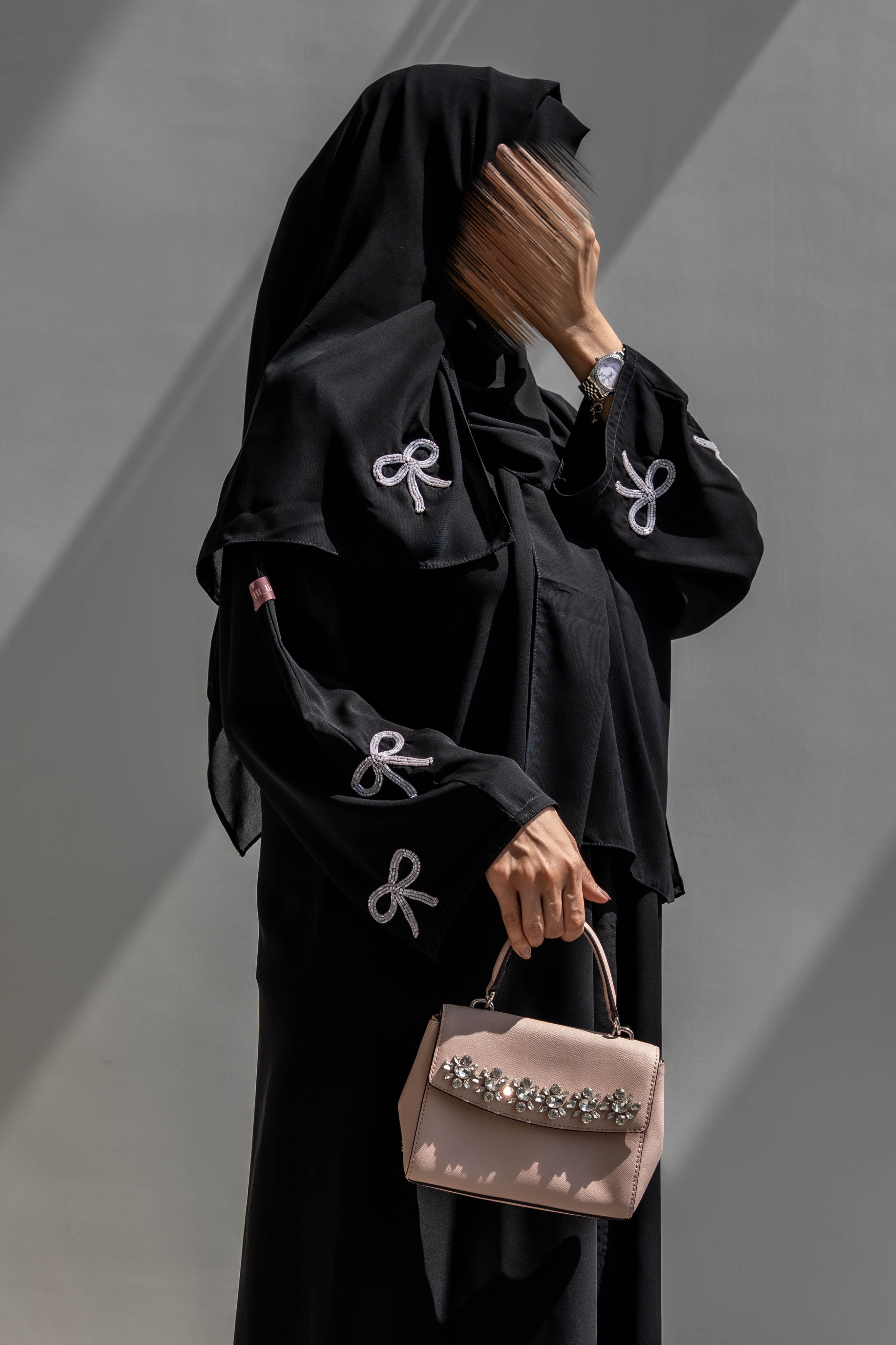 عباية تطريز فيونكات: مصنوعة من قماش المستقبل الفاخر، بتصميم أنيق مزين بتطريز فيونكات يمنحكِ مظهرًا أنثويًا جذابًا، تأتي مع طرحة متناسقة لتكمل إطلالتكِ.